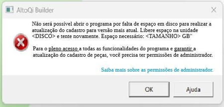 A mensagem "Não será possível abrir o programa por falta de espaço em disco para realizar a atualização do cadastro para versão mais atual. Libere espaço e tente novamente" costuma ser exibida na primeira abertura do AltoQi Builder após uma instalação ou atualização.