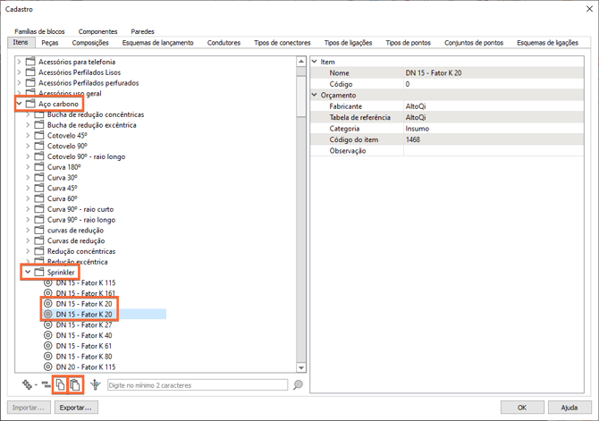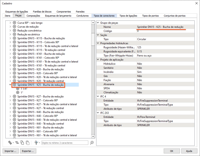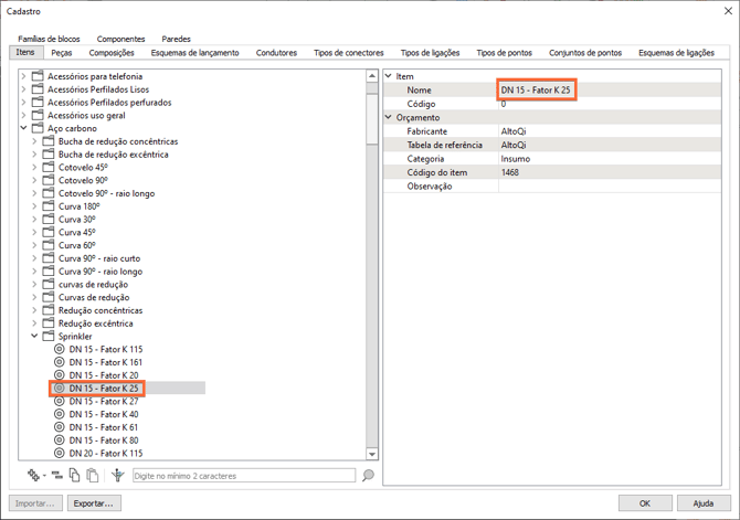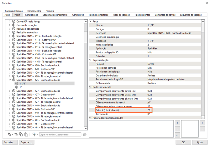 O Fator K de um sprinkler pode ser alterado através do Cadastro de peças, primeiro cadastrando um item correspondente ao sprinkler com Fator K desejado (para que seja contabilizado corretamente na lista de materiais) e depois cadastrando a peça para lançamento no projeto, conforme os procedimentos a seguir: