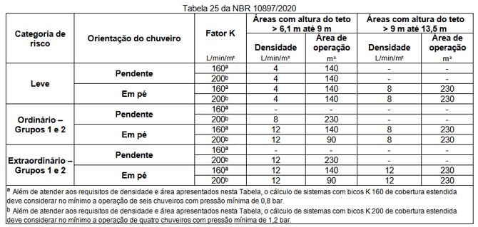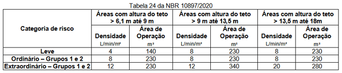 Nos projetos de rede de sprinklers, cada edificação está associada a um risco (leve, ordinário grupo I, ordinário grupo II, ordinário grupo III, extraordinário grupo I e extraordinário grupo II). E cada risco está vinculado a um limite máximo para a área de operação, conforme a Figura 42 da NBR 10.897/2020 apresentada a seguir.