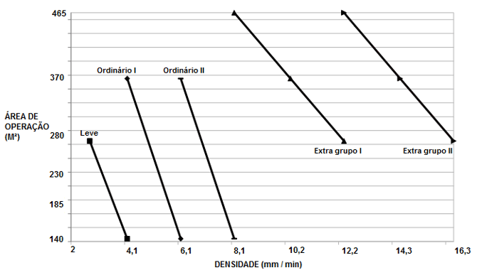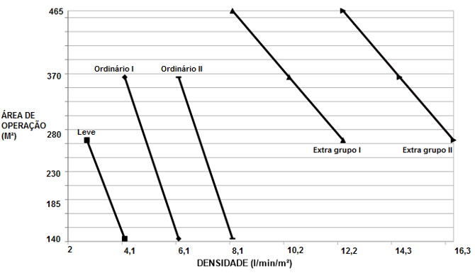 Neste critério, o programa calcula automaticamente o valor de densidade do projeto e apresenta-o no campo Densidade do projeto (l/min/m²), conforme as curvas de cada risco da edificação e a área de operação, dispostas na Figura 42 da NBR 10897/2020.