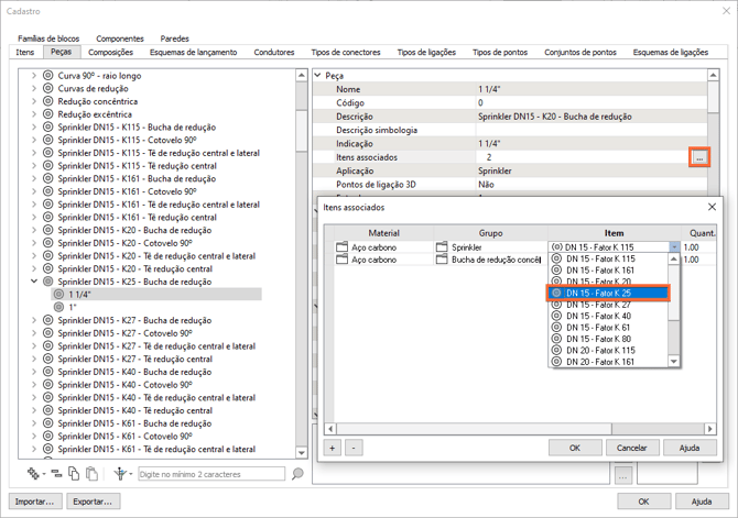 - Nas peças que você deseja alterar o Fator K, acesse o campo Itens Associados e altere para o item do Sprinkler criado previamente;