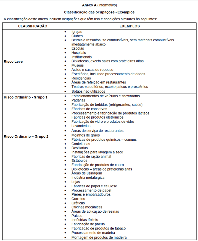 A tabela apresentada abaixo, exemplifica a classificação de ocupação constante nos anexos da NBR 10897/2020.