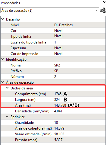 - À direita da tela, junto da janela Propriedades , perceba que no grupo Área de operação - Dados a área de operação é igual ao produto entre o seu comprimento e largura, como destacado a seguir.