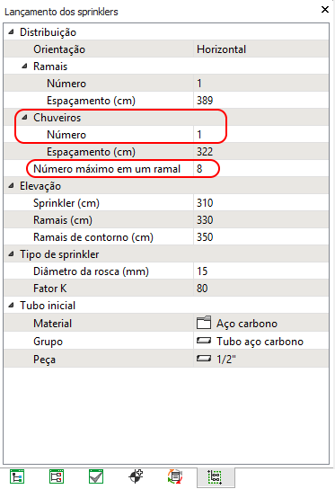 - Chuveiros - Número: Quantidade de sprinklers em cada ramal. Caso este valor seja alterado, o campo Espaçamento (cm) é modificado automaticamente;