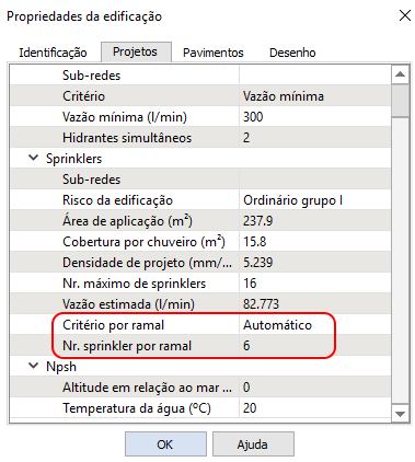 O número máximo de Sprinklers por ramal pode ser definido no momento da criação de uma nova Edificação. Se o projeto já estiver em andamento, pode-se realizar alterações acessando as Propriedades da Edificação.