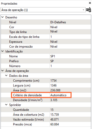 Na plataforma AltoQi Builder o critério de densidade é utilizado para estimar a vazão dos sprinklers no projeto. É possível alterar o critério de densidade e inserir o valor desejado nas propriedades do projeto de Sprinklers, dependendo dos enquadramentos normativos a ser considerado em cada projeto.