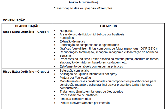 - Extraordinário - grupo 1: Ocupações nas quais a combustibilidade dos conteúdos são muito altas, pode ter a presença de materiais que provoquem incêndios de rápido desenvolvimento e com alta taxa de liberação de calor. Neste risco a ocupação não pode contem líquidos combustíveis ou inflamáveis.