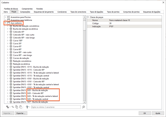 - Acesse a Classe do material do Sprinkler (Ferro maleável, Aço carbono, Cobre, etc);