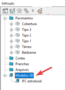 - Após a importação, o modelo IFC será exibido na janela de edificação do projeto, dentro de modelos 3D.