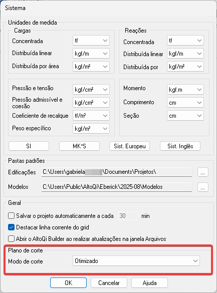 Configure o modo de corte desejado para o plano de corte em Guia Estrutura > grupo Configurações > Sistema > Sistema: