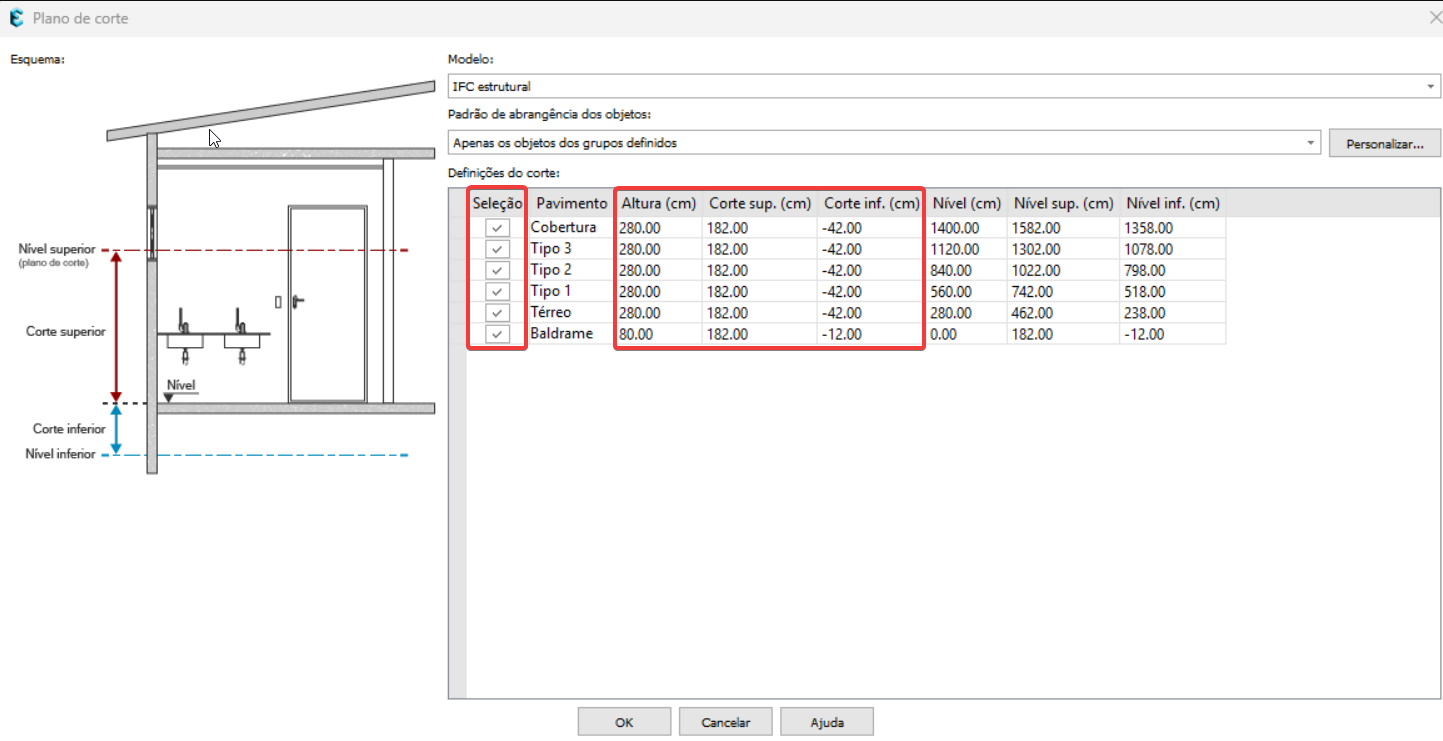 Defina as elevações de corte superior e inferior de cada pavimento (com base no nível da estrutura).