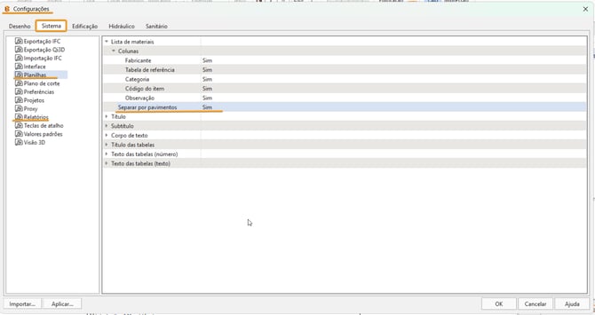 A personalização da lista de materiais pode ser realizada diretamente nas configurações do sistema. Para isso, acesse Configurações > Sistema > Planilhas ou Relatórios e, nos campos disponíveis, defina os critérios desejados, como por exemplo, se a listagem será separada por pavimento, defina como Sim.
