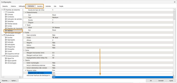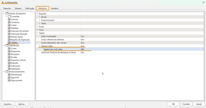 Caso seja necessário configurar a separação por redes ou sub-redes, o ajuste deve ser feito em Configurações > [Disciplina] > Padrões de desenho > Tabelas, onde é possível definir o comportamento de agrupamento das informações conforme o padrão adotado no projeto.