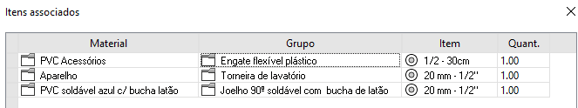 A imagem abaixo mostra um exemplo de como pode ser preenchida a janela de itens associados para um "Lavatório com joelho de 90 - 20 mm".