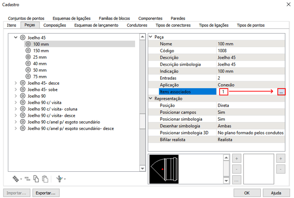A quantidade informada será o valor da unidade que foi preenchida no momento da criação do item. Além disso, você pode adicionar quantos itens desejar para uma mesma peça. Ao preencher a janela dos Itens Associados de uma peça do tipo "Conduto", recomendamos que leia o artigo Lista de materiais de condutos.