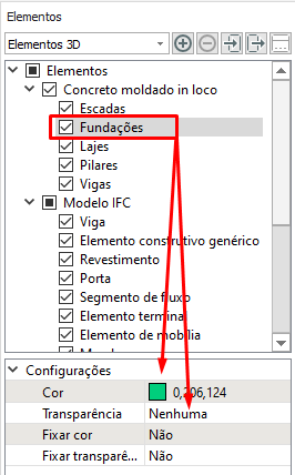 No caso de elementos ainda serem exibidos todos na cor branca no pórtico, acesse o menu 3D - Configurações - Elementos e confirme se os elementos estão configurados com cores específicas e sem transparência, por exemplo:
