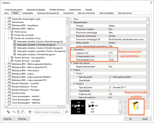 - Quando a peça utilizada não possuir uma simbologia 3D no cadastro, ela será representada de acordo com as informações dos campos de Geometria cadastradas. Esta representação é denominada Paramétrica.