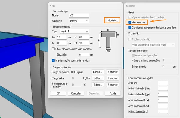 Ao habilitar a opção "Mesa na laje", será considerado o aumento da inércia da seção (de uma viga retangular para uma viga T, por exemplo) devido à presença de laje adjacentes à viga, e portanto sem acréscimo do peso próprio da viga (em relação à seção retangular), pois este peso já está sendo considerado nas lajes. Quando se deseja lançar uma viga T isolada, por exemplo, sem a presença das lajes adjacentes, deve-se desabilitar a opção "Mesa na laje".