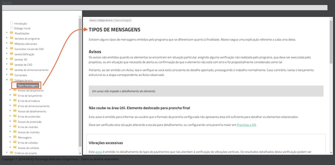 - Selecione a opção Conteúdo para acessar Ajuda completa do AltoQi Eberick, em que, no menu lateral, pode-se localizar conteúdos quanto às janelas de dimensionamento do programa, códigos de erros/avisos, além das alterações realizadas em cada nova versão do programa, entre outros: