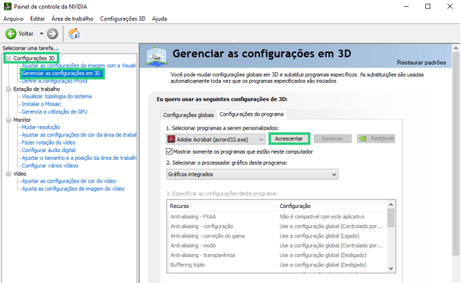 - O próximo passo é especificar as configurações específica de uso da placa de vídeos para o programa. Desta forma, mantenha:
