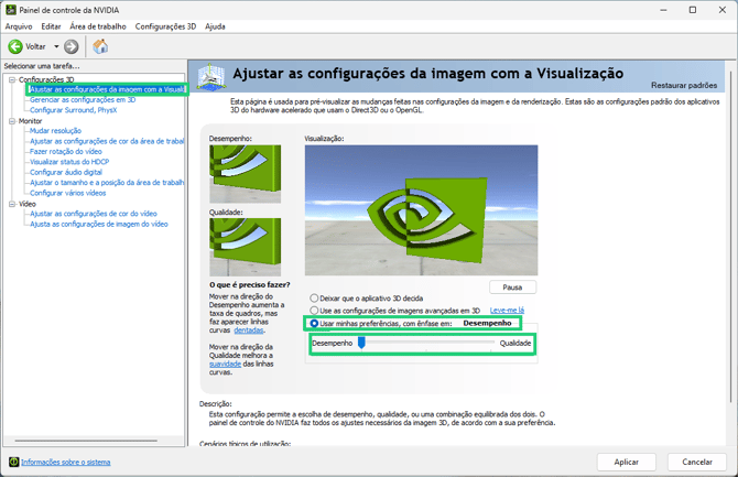 - Estas configurações priorizam o desempenho da placa, portanto a qualidade gráfica pode ser reduzida.