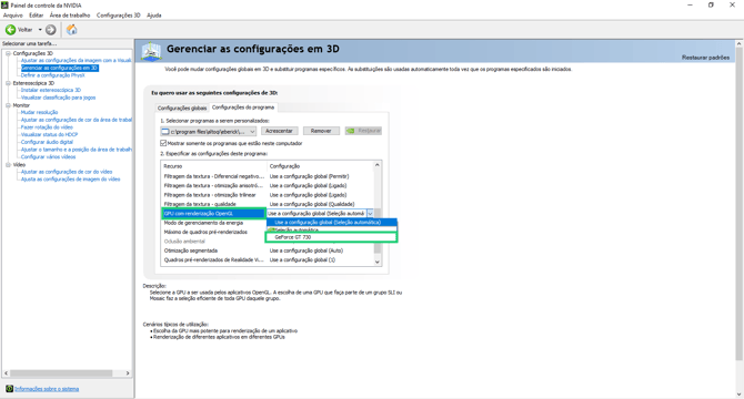 - GPU com renderização OpenGL: selecione a sua placa de vídeo NVIDIA