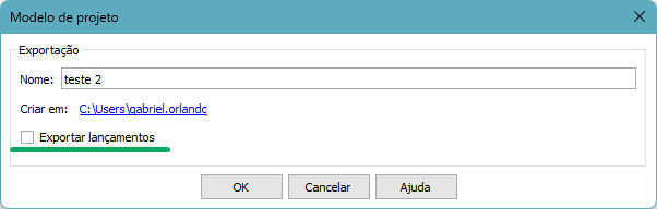 - Na caixa de diálogo Modelo de projeto, defina o nome, local de salvamento, e se deseja salvar os lançamentos já existentes no projeto atual, como mostra a imagem abaixo;