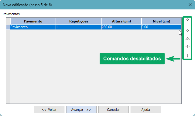 Para manter a compatibilidade estrutural, o programa exige que o novo projeto tenha o mesmo número de pavimentos do template, bloqueando a adição de novos pavimentos durante a criação da edificação.