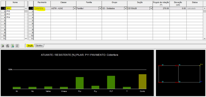 No exemplo abaixo, vemos um pilar P11 que apresentou o Erro D194 - Momento fletor solicitante maior que o resistente na verificação de flambagem local.