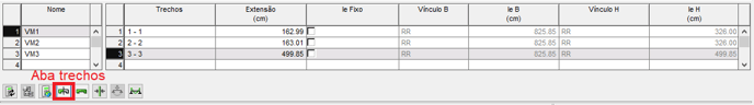Pelos ícones abaixo da tabela de vigas, note que existe também a aba Trechos: