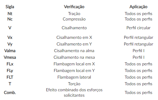 O AltoQi Eberick realiza diferentes verificações de esforços e efeitos combinados nos perfis metálicos, e algumas destas verificações são específicas ao perfil adotado. Veja na tabela abaixo quais verificações são feitas para cada perfil:
