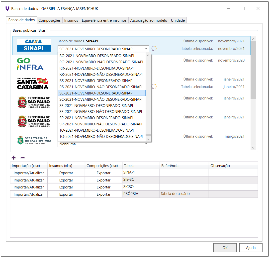 - Na aba Banco de dados, selecione a versão mais recente da tabela desejada, para o estado desejado;