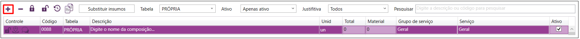 Ao criar uma nova composição, você deve inserir insumos e composições que irão ser utilizadas calcular o preço da composição. Isso pode ser feito na região inferior da janela.