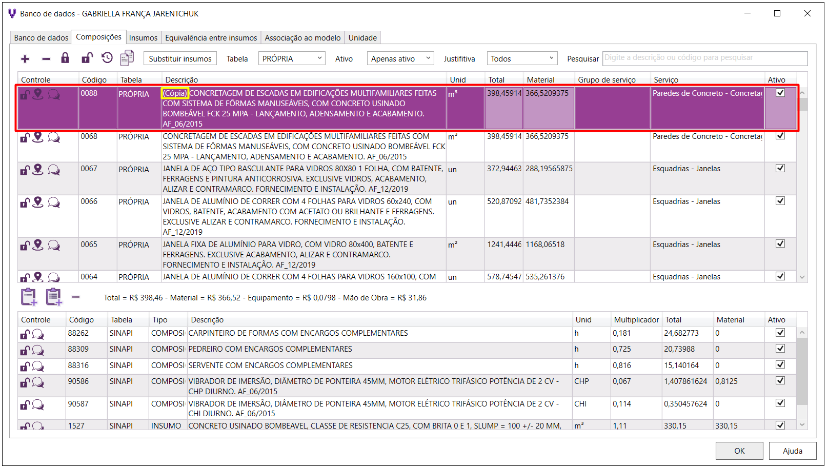Feito isso, a composição será duplicada. Note que, ao duplicar uma composição, ela será sempre considerada como Própria, mesmo que a composição de origem tenha sido a tabela do SINAPI, SICRO, entre outras. Isso é importante pois garante que os bancos de dados oficiais não serão alteradas.