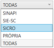 Nesta janela, você terá acesso a todos os insumos do projeto, sendo que você pode filtrá-los por tabela. Note que o programa disponibiliza também a tabela PRÓPRIA, que irá reunir todos os elementos cadastrados pelo orçamentista. Esta distinção permite que você separe os seus insumos dos demais.
