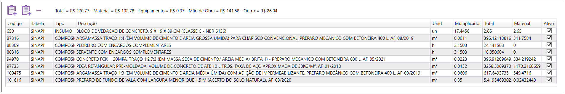 Com essas ferramentas, você já deve conseguir personalizar sua composição para adequá-la ao orçamento. Note que ao cadastrar os elementos, já é possível definir no campo Multiplicador o quanto de cada insumo será utilizado na composição presente. O Preço de cada um é calculado com base nesse multiplicador, bem como o Preço Material. Além disso, o preço Total da composição, bem como o preço do Material da composição serão atualizados.