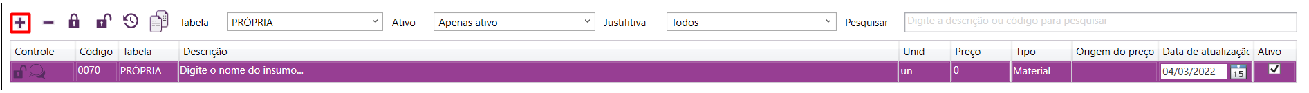 - Em Tabela, é mostrado de qual tabela vem o insumo. No nosso caso, será sempre mostrado PRÓPRIA pois estamos criando esse insumo.