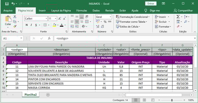 Template para planilha eletrônica de insumos