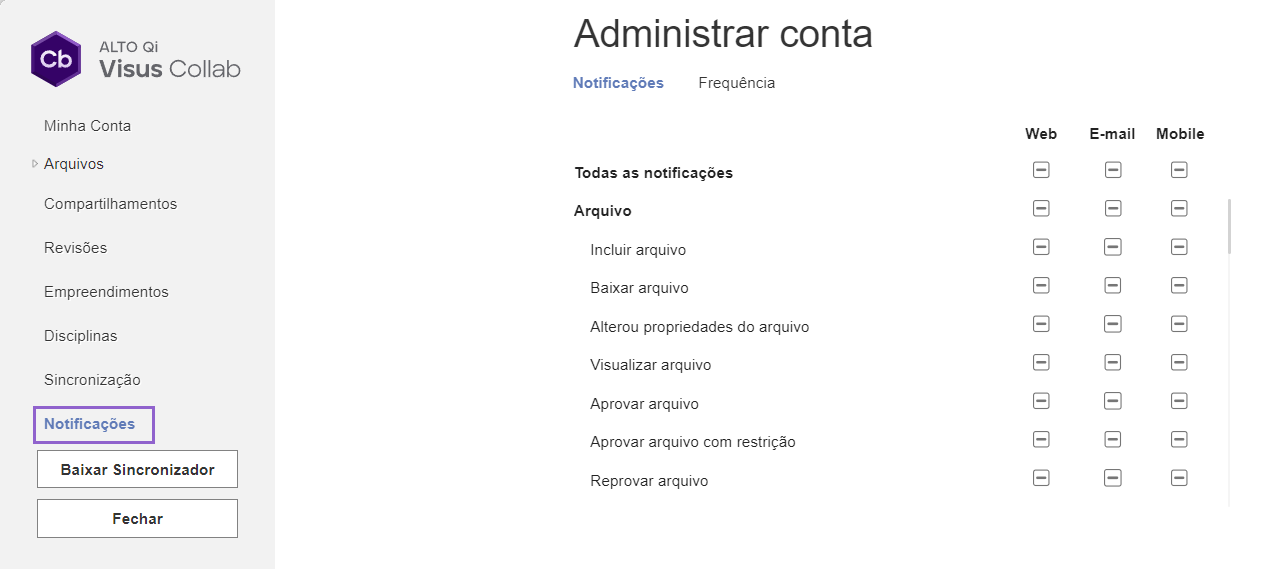 Mobile - com esta opção o usuário poderá receber as notificações em seu mobile através do aplicativo AltoQi Visus Collab, segundo as regras configuradas na aba frequência.