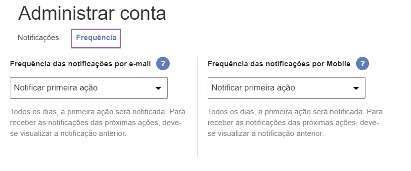 Para evitar o envio demasiado de notificações, nesta aba o usuário pode configurar a frequência com que estas serão recebidas em seus e-mails ou no mobile.