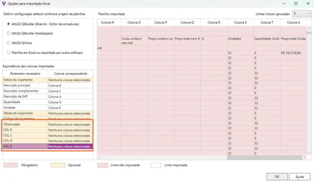 1- É possível importar Observações e outras colunas adicionais da planilha para a lista de quantitativo no Visus Cost?