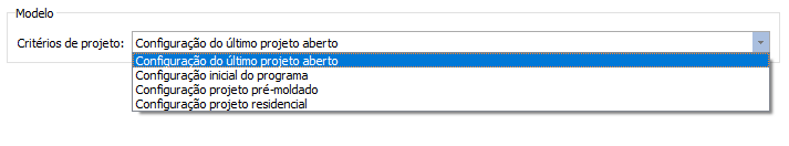 Observação: Caso apareça apenas a opção "Configuração do último projeto aberto" verifique a pasta padrão configurada para Modelos, acessando a Guia Estrutura > Configurações > Sistema > Sistema > Pastas padrões > Modelos, e se nela constam arquivos de modelos criados na versão que está sendo utilizada. Lembrando que também é possível importar um arquivo modelo a qualquer momento durante o desenvolvimento do projeto como descrito em Como copiar as configurações de um projeto do Eberick.