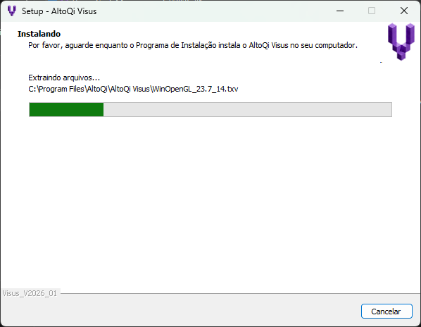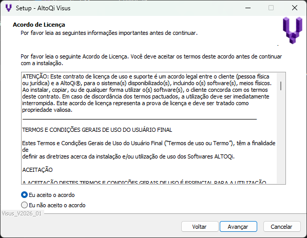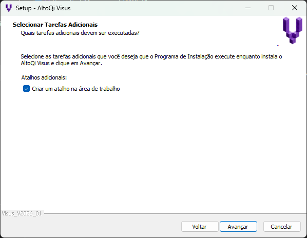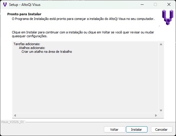 - Na janela seguinte, teremos a confirmação que o instalador está pronto para iniciar a instalação do AltoQi Visus no seu computador. Clique em Instalar;