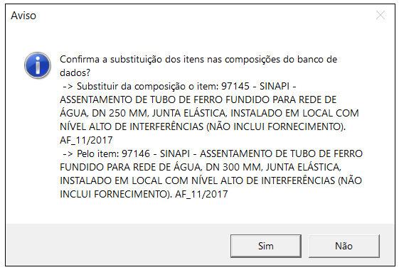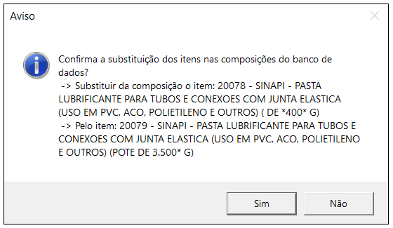 Ao confirmar, clicando em Sim, todas as composições do projeto que tinham o insumo de n° 20078, passarão a ter o insumo substituído pelo de n° 20079.