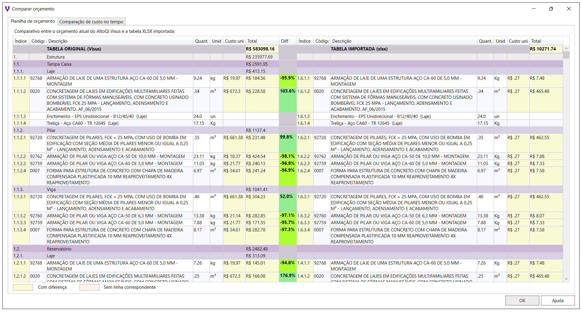 Esse recurso tem o objetivo de avaliar as variações de custos no orçamento ou planejamento de um projeto, visando avaliar o impacto no custo ao atualizar a base de orçamento ou atualizar o modelo IFC. A comparação é realizada por meio de uma versão "atual" do orçamento/planejamento com uma versão "antiga" que foi já foi salva. No primeiro passo, o usuário faz a importação do orçamento/planejamento para o AltoQi Visus, sendo desenvolvido essa extensão na importação XLSX do software. Após importar, é possível avaliar todas as modificações. A comparação é um processo bem complexo, pois o usuário pode ter apagado/adicionado novos itens, movido os elementos de locais entre outras complexidades. Através de diversos critérios, o AltoQi Visus monta a estrutura de comparação.