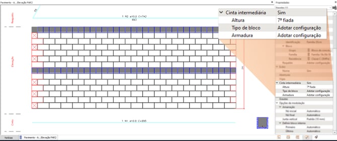 Para habilitar o uso da cinta intermediária em uma determinada parede, é necessário selecionar a parede desejada e acessar suas propriedades. Nas propriedades é possível configurar a inserção da cinta intermediária, além da possibilidade de optar pela escolha da altura, tipo de bloco ou armadura. Vale ressaltar que a amarração da cinta neste detalhamento sempre será indireta.