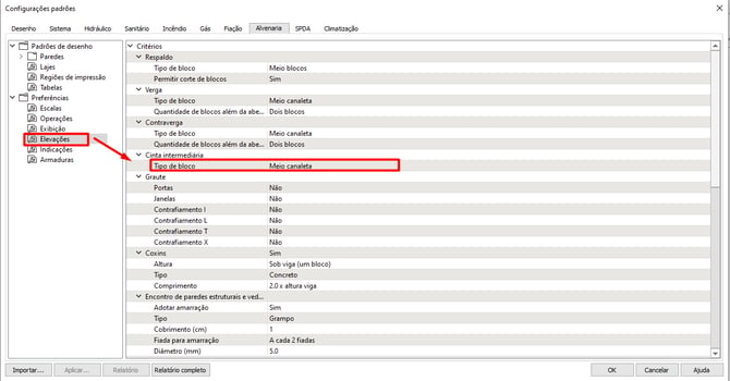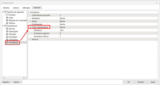 Ainda, nas configurações em "Arquivo - Configurações - Aba Alvenaria - Armaduras" é possível determinar o diâmetro e quantidade de barras da armadura a ser inserida na cinta intermediária: