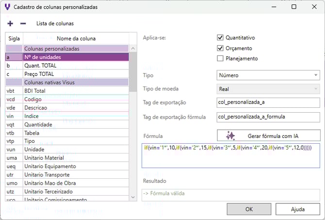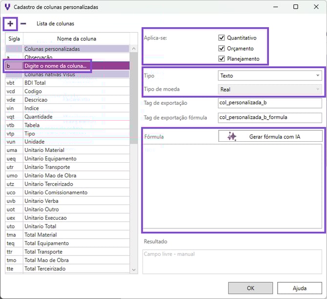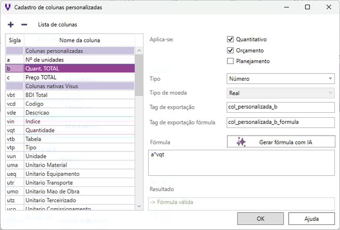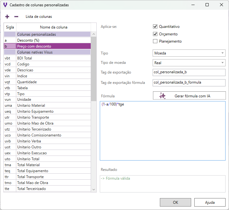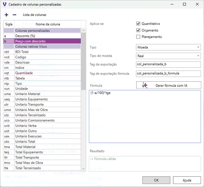 - Aplica-se: selecione os tipos de listas que deseja que a coluna seja exibida: Quantitativo, Orçamento ou Planejamento.