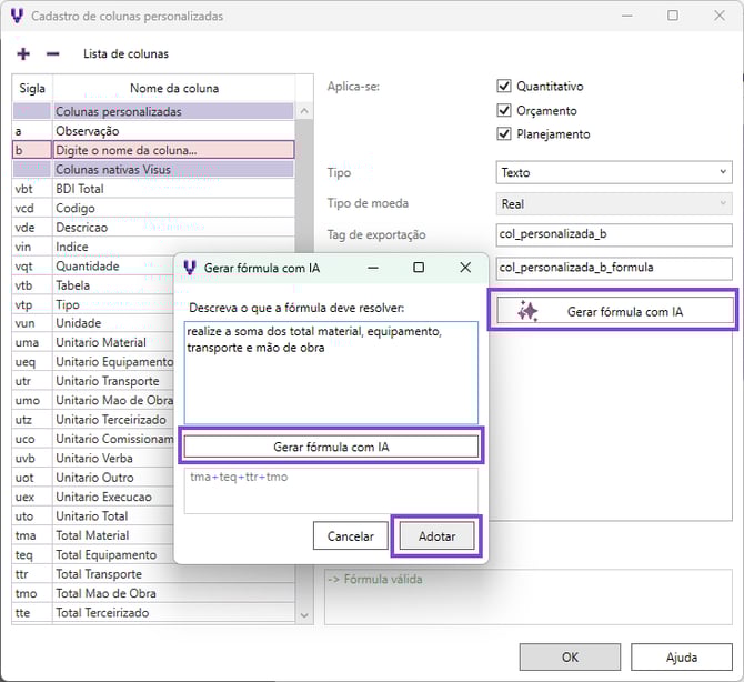 - Para incluir uma fórmula, utilize a opção "Gerar fórmula com IA", descreva que operação que deseja aplicar, clique em Gerar fórmula com IA, que a fórmula será gerada com a sintaxe interpretada pelo Visus Cost. Clique Adotar, para aplicar a fórmula; OU