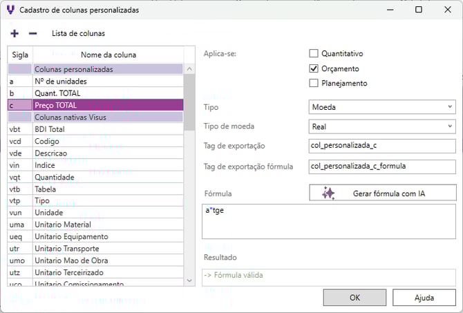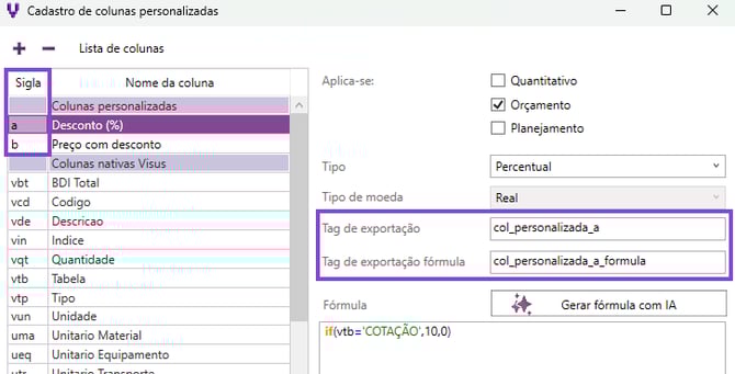 - Tag de exportação fórmula: utilizada para exibir no relatório um memorial de cálculo da coluna, ou seja, a lógica aplicada na fórmula configurada. Essa tag segue o formato: <col_personalizada_SIGLA_formula>